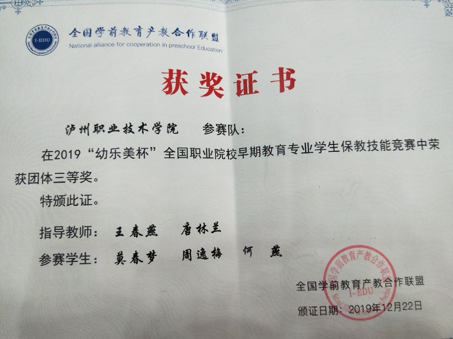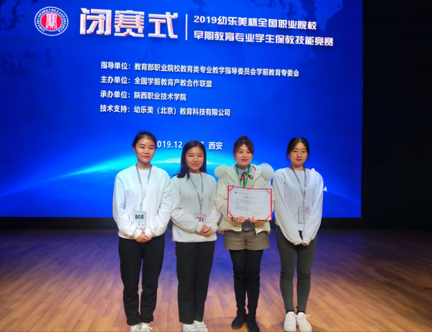 12月19日-23日,2019年“幼乐美杯”全国职业院校早期教育专业员工保教技能竞赛在陕西职业技术公司举行。人文公司学前教育专业骨干教师王春燕带领员工莫春梦、周逸梅、何燕前往参赛并喜获团体三等奖,实现了公司学前教育专业国赛零的突破。