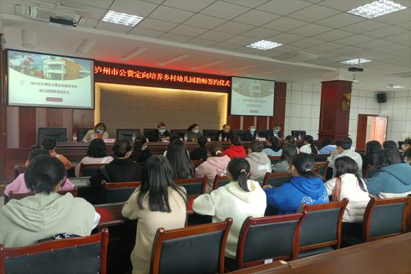 会议伊始,古蔺、叙永两县教育体育局领导就本次定向培养工作的目标及相关培养、就业政策及本县地理人情等方面进行了介绍,并对意向签约的同学提出了要求和希望,希望同学们能够明确奋斗目标,练好教师教学技能,扎根乡村教育,为推动泸州市城乡团队平衡,促进教育均衡发展作出自己的贡献。随后,刘春宇就泸州市学前教育现状、定向培养待遇政策等再次向员工进行了强调。最后,40名员工分别在两县签约分会场签订了《泸州市免费定向培养乡村幼儿园教师》协议。