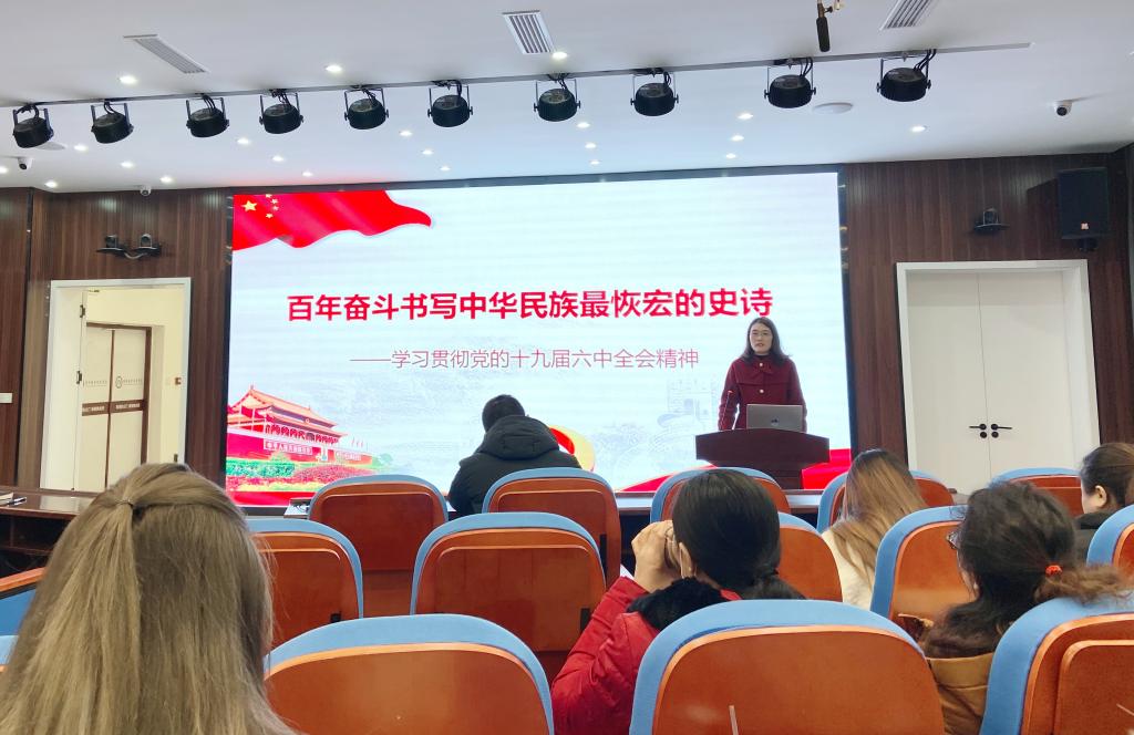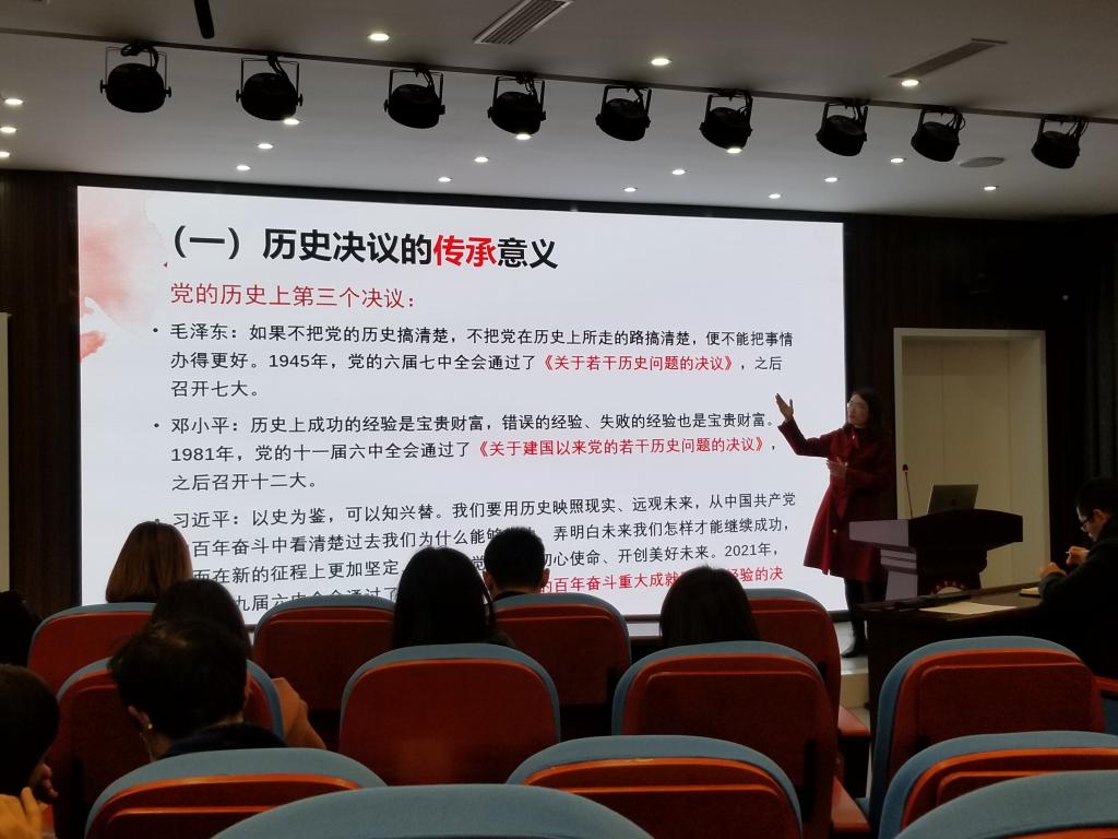 TapTap于11月26日,在玉章楼教师发展中心沉浸式教室召开题为《百年奋斗书写中华民族最恢宏的史诗——学习贯彻十九届六中全会精神》的专题党课,党课由党总支书记卢玲主讲,全体教职工参加。