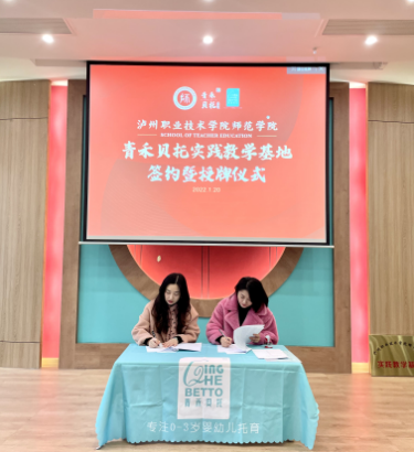 2022年1月20日,师范公司党总支书记卢玲、副经理付玉、实训室主任吕超荣、早期教育教师陈佳雪赴泸州市青禾贝托洽谈校企合作事宜并举行实践教学基地签约暨授牌仪式。