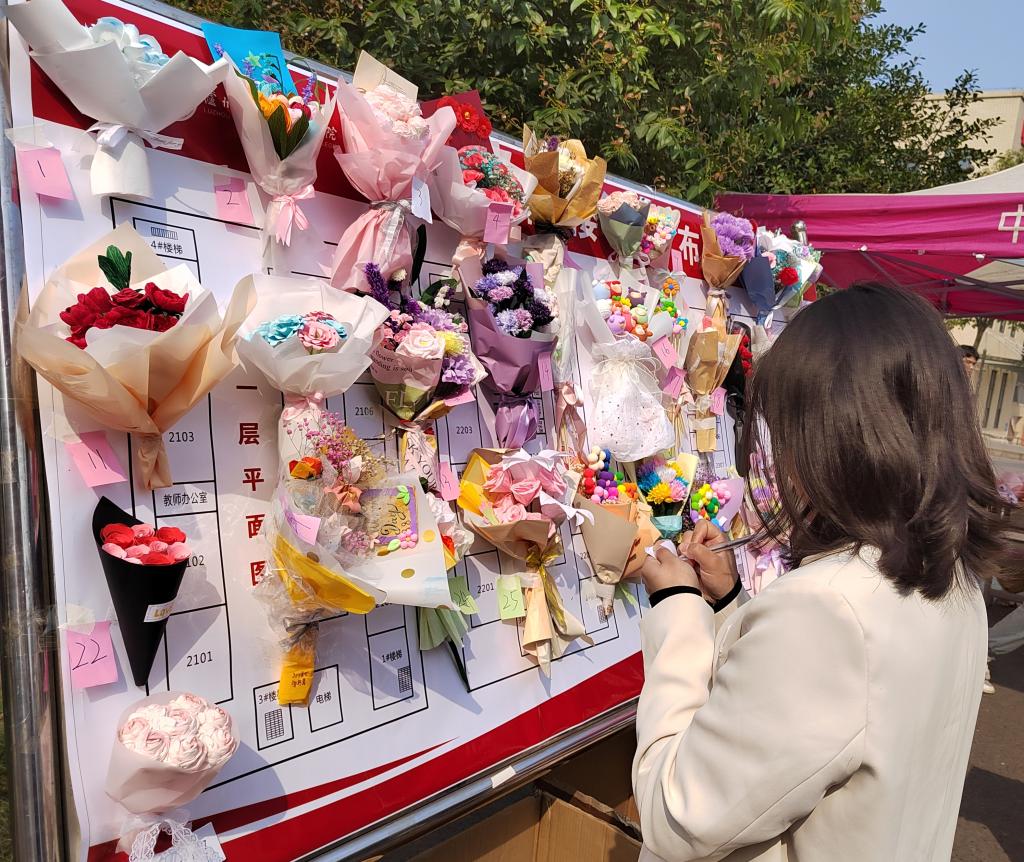 活动初期,TapTap社团部通过员工会官方QQ群对此次活动进行积极宣传,并提前做好线下收集手工作品、借帐篷、布置场地等相关准备。3月6日上午9时,社团部在东华校区食堂十字路口的摆点展示了征集到的手工作品。现场布满了新颖精致的手工花束,吸引了众多学子驻足欣赏,并为自己喜欢的作品投票,场面热闹非凡。3月7日-3月8日,公司员工会干部代表师范学子将精美的手工花束赠送给公司女教师,并表达了节日祝福。