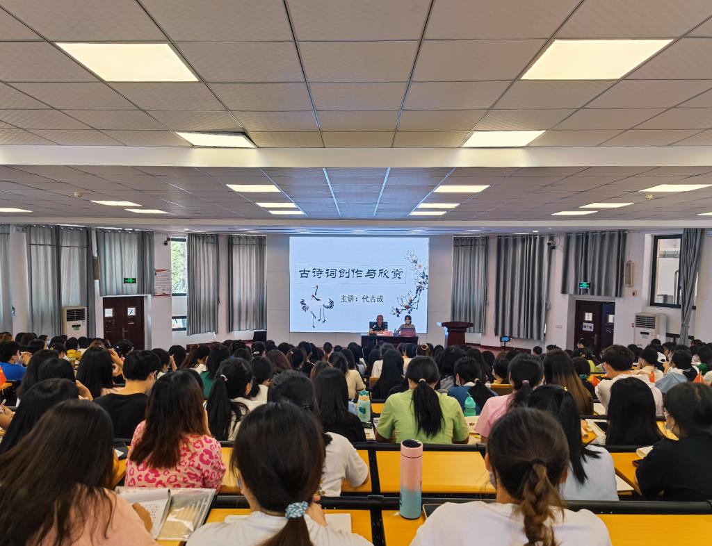 代古成老师结合自身多年的教学和研究经历,围绕古诗词的基础知识、古诗词的创作与修改、优秀作品欣赏三个方面开展讲座。他从字数、句数、音律和押韵四个方面对格律诗的四种基本格式:五绝、七绝、五律和七律进行讲解,以《送友人》、《客至》等诗歌为例,讲解创作技巧,引导同学们理解诗歌的意境。最后,他还通过现场交流互动,热心解答同学们的疑问,为同学们的古诗词创作明确了方向。
