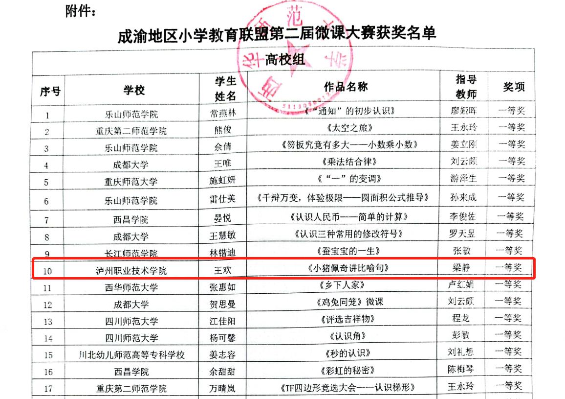 日前,成渝地区小学教育联盟第二届微课大赛公布获奖名单,在19所高校提交的210份作品中,公司教师梁静指导的2020级小教专业王欢同学的作品《小猪佩奇讲比喻句》、李良勇指导的2020级小教曾秀梅同学的作品《地月系的形成》分别获得大赛的一、二等奖。