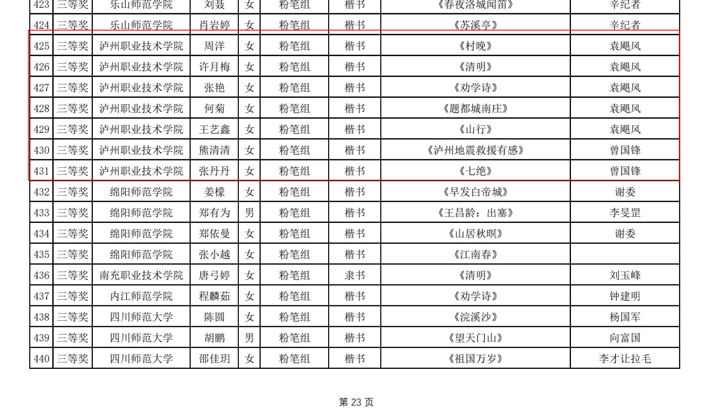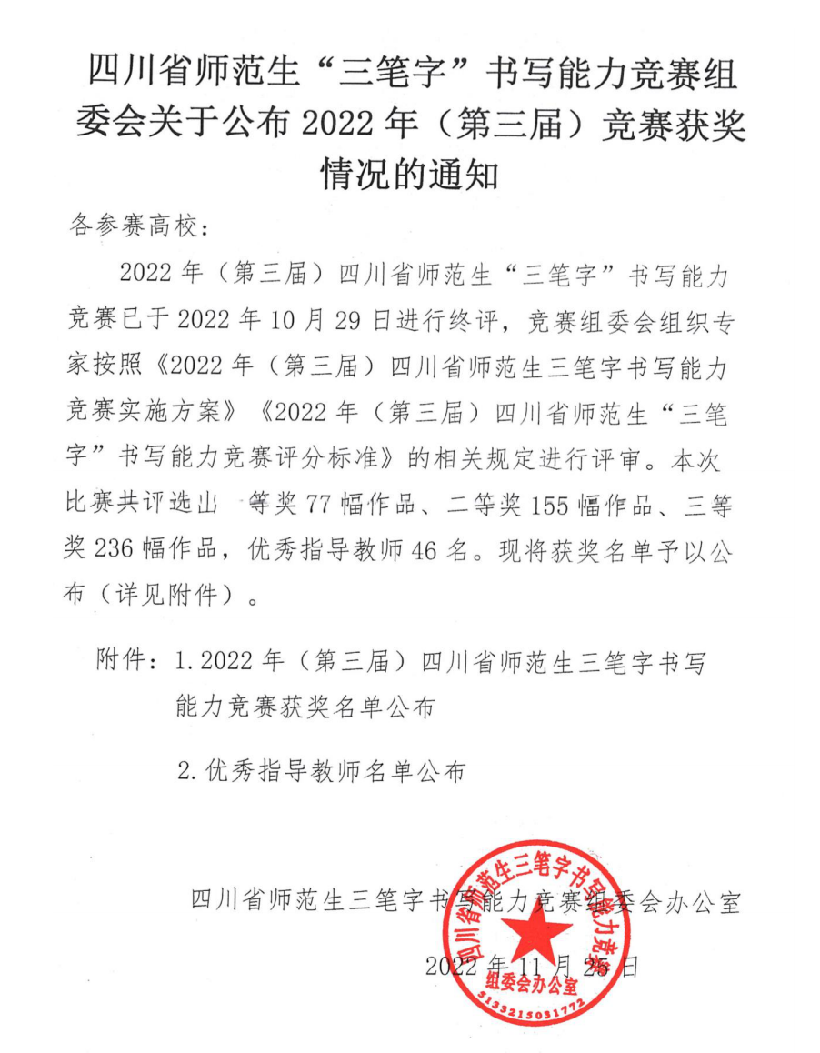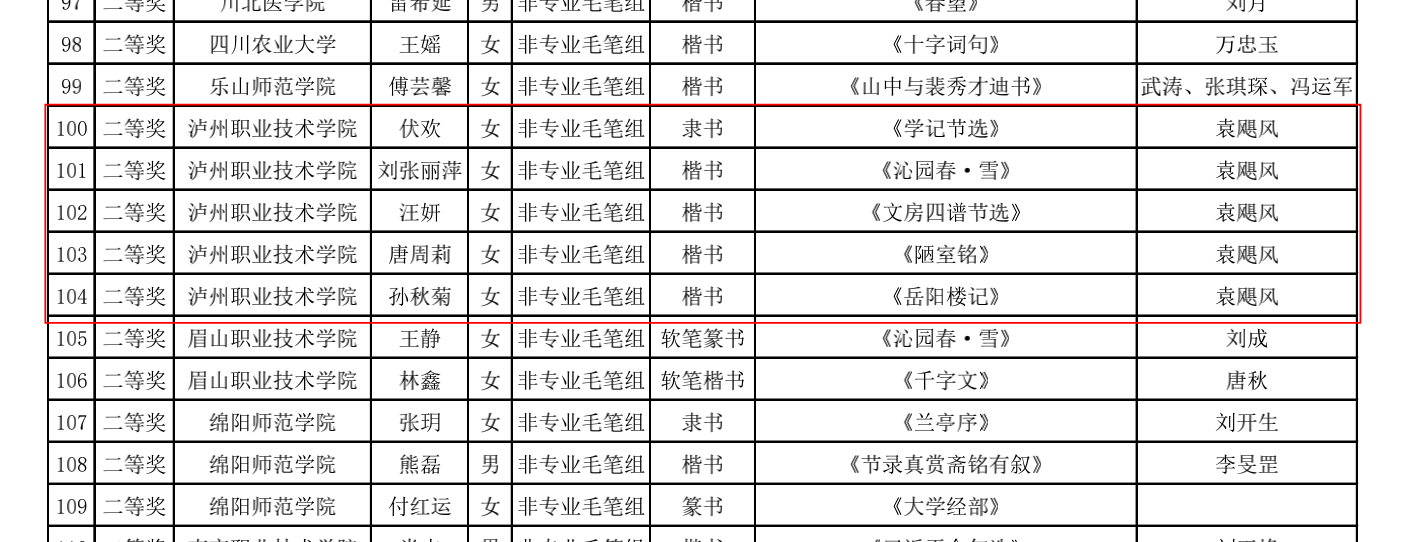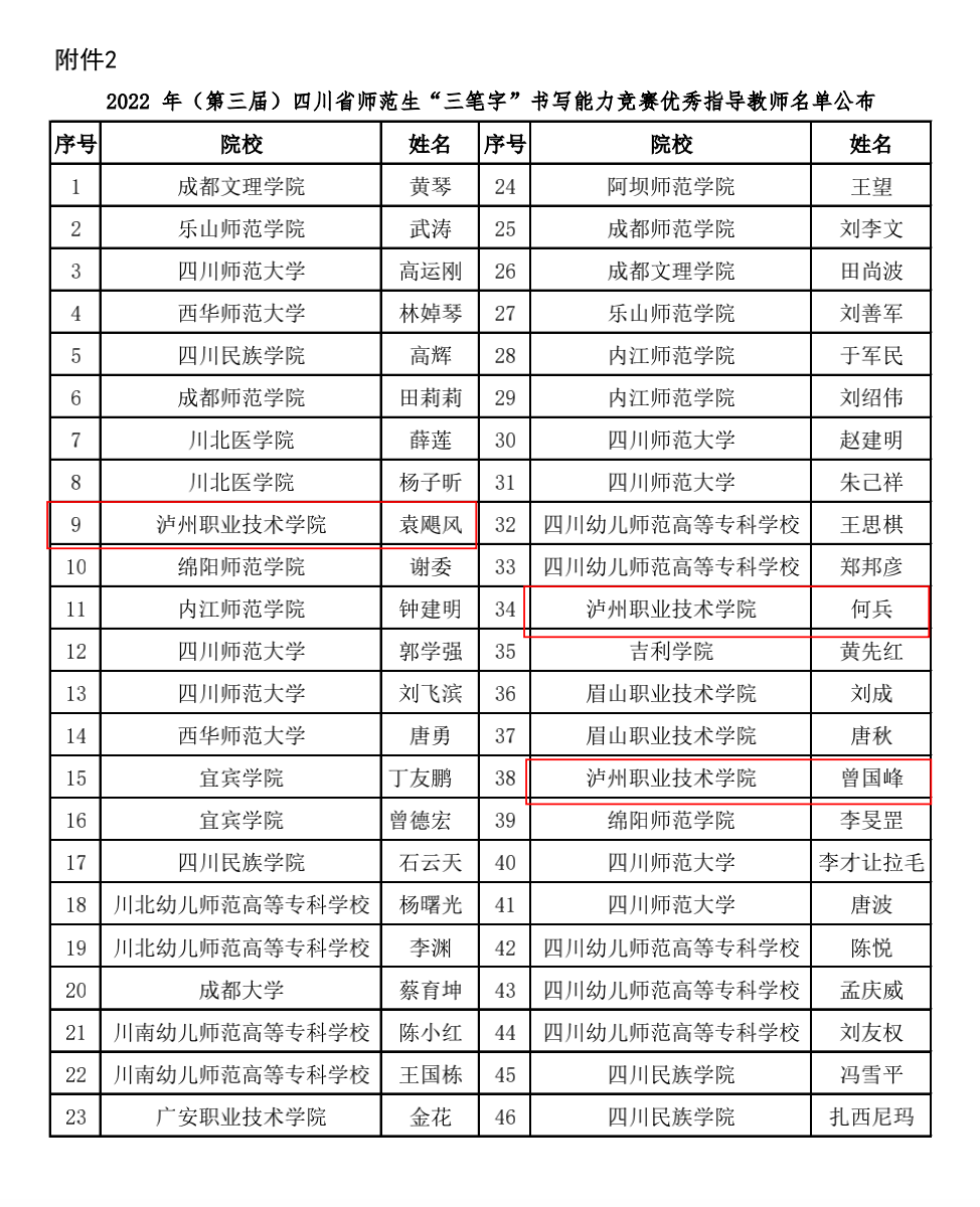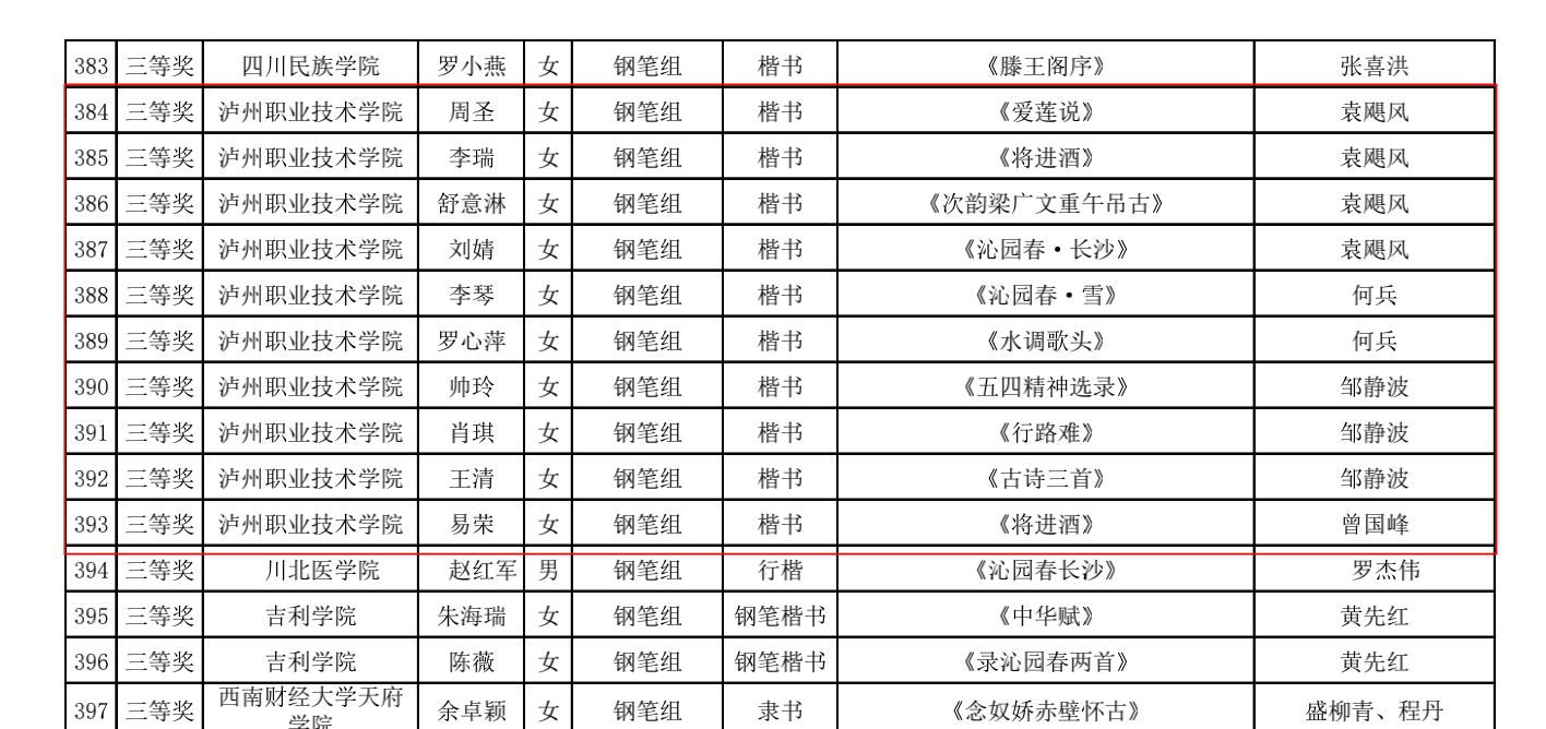 近日,2022年第三届四川省师范生“三笔字”书写能力竞赛获奖名单正式公布。TapTap学子与全省本专科高校员工再次同场竞技,获一等奖4人次,二等奖10人次,三等奖21人次,获奖人次居此次参赛高职院校首位。何兵、曾国峰、袁飓风三位老师被评为本届赛事优秀指导教师。