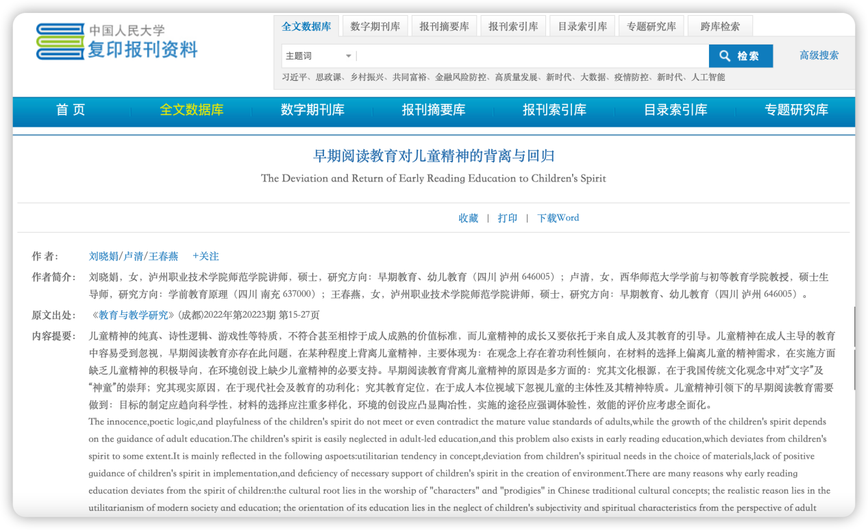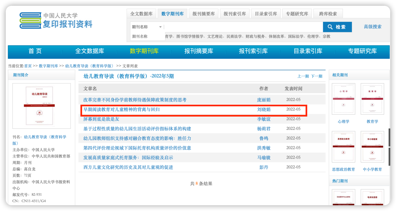 近日,从中国人民大学复印报刊资料数据库获悉,公司TapTap刘晓娟、王春燕老师撰写的论文《早期阅读教育对儿童精神的背离与回归》(原载《教育与教学研究》2022年第3期)被中国人民大学书报资料中心复印报刊资料《幼儿教育导读(教育科学版)》2022年第5期全文转载。