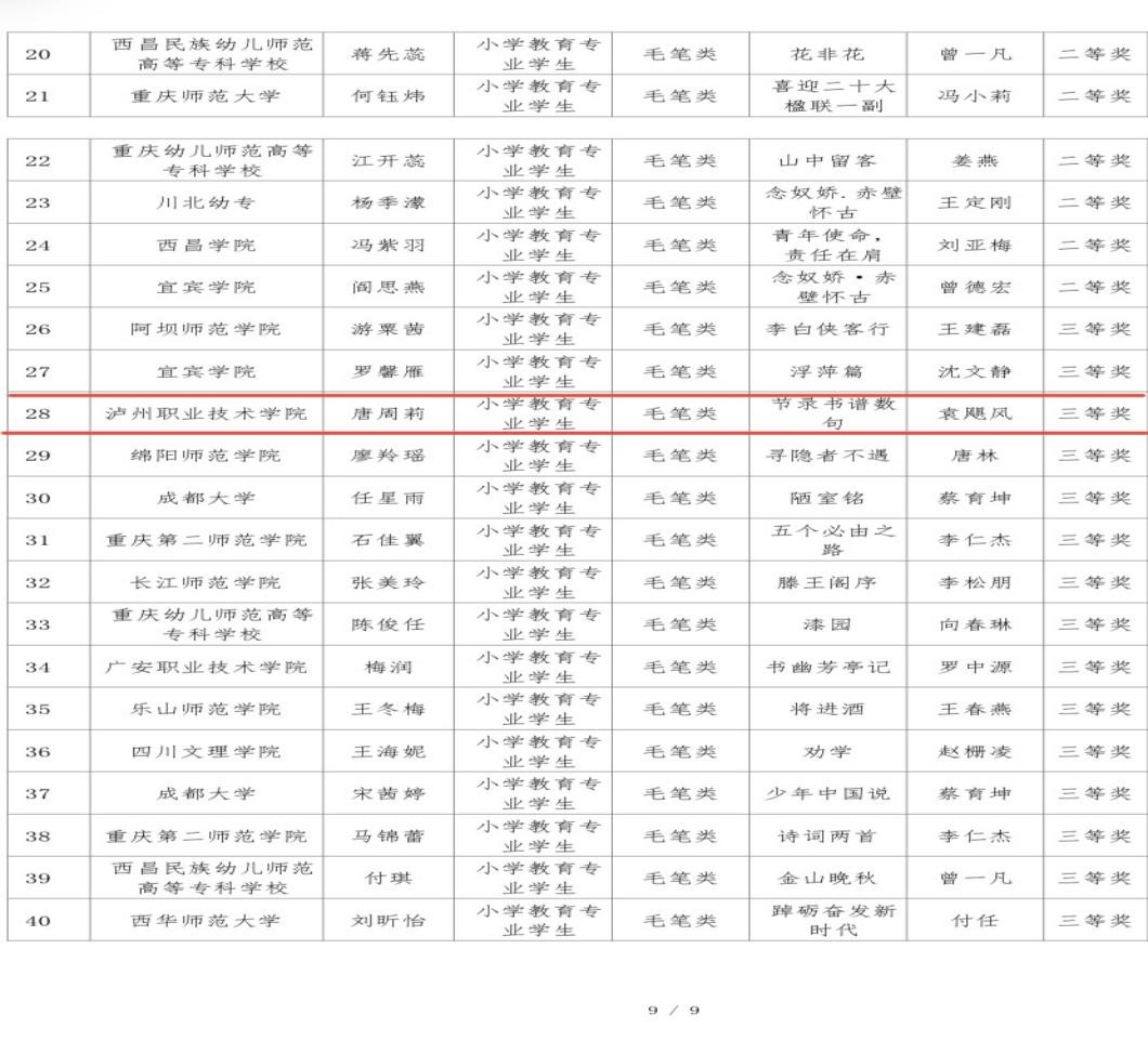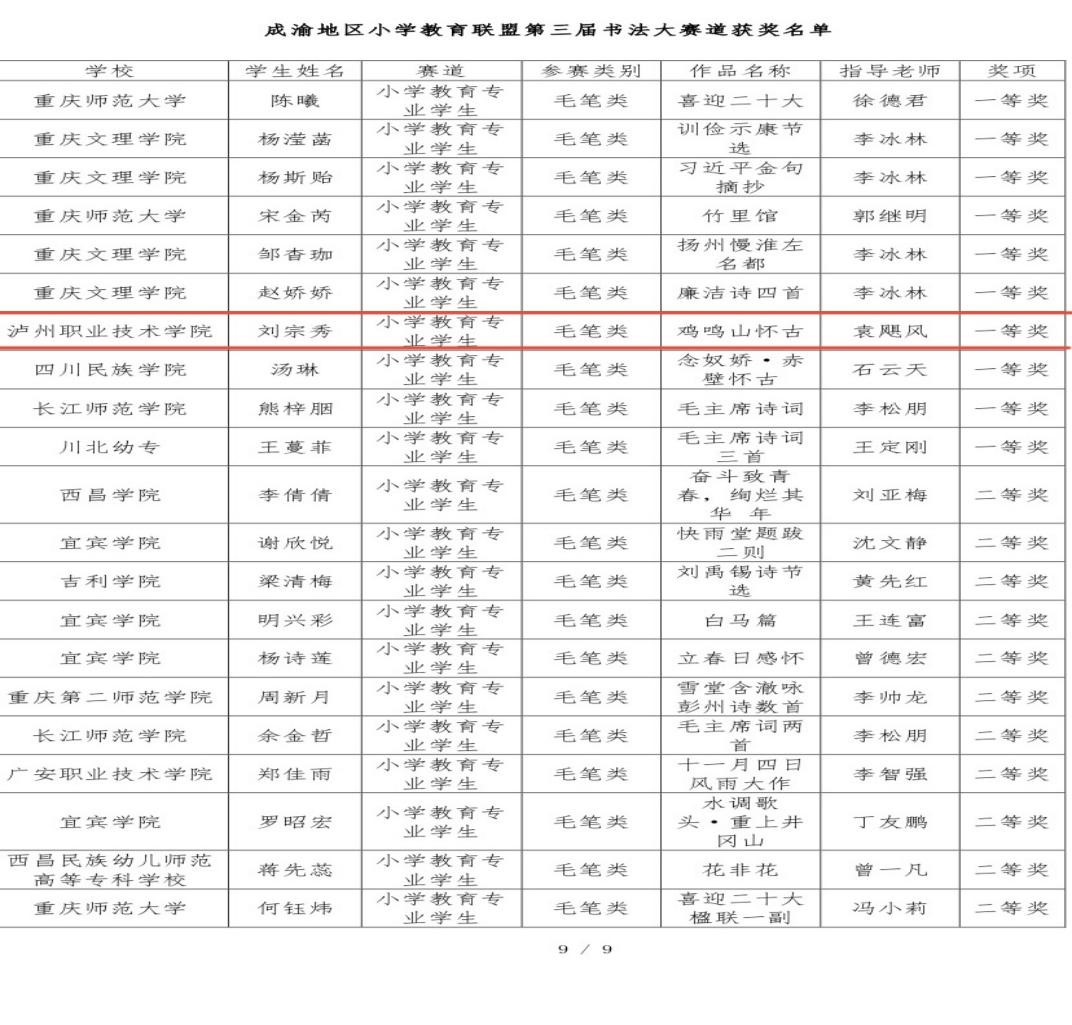 2023年7月,成渝地区小学教育联盟第三届书法大赛圆满结落幕,2021级小学教育专业员工刘宗秀、唐周莉两名选手分别荣获高校员工赛道毛笔组一等奖和三等奖。