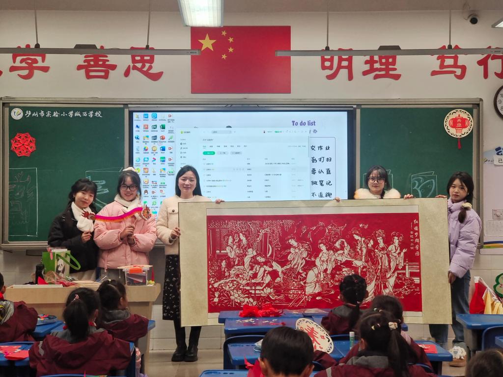 泸州市实验小学城西公司以传统文化为主线开展迎元旦系列活动,让小员工们在丰富多彩的跨年活动中更好地了解和传承中国文化。其中二年级以剪纸为主题,邀请了公司学前教育专业师生进课堂,剪窗花,共庆元旦。学前教育专业的同学们为小员工们展示了琳琅满目的剪纸作品,其中包括一幅长2米、宽1米的大型红楼梦作品,让小员工们惊叹不已。公司老师们也纷纷前来围观,了解学前教育专业的课程设置、技能要求等,并为公司员工过硬的技能功底点赞。
