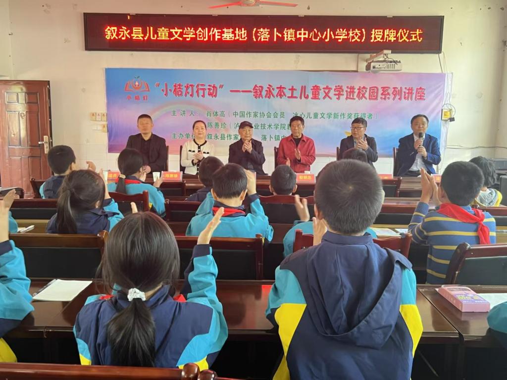 授牌仪式上,邱磊董事长盛情致辞。叙永县作家协会主席靳朝忠介绍儿童文学“叙永现象”以及儿童文学创作基地建设的目的和意义,祝愿儿童文学在落卜镇中心校生根、开花、结果。靳朝忠主席与邱磊董事长共同签署县作协与镇中心校共建儿童文学创作基地协议,并授予“儿童文学创作基地”牌匾。