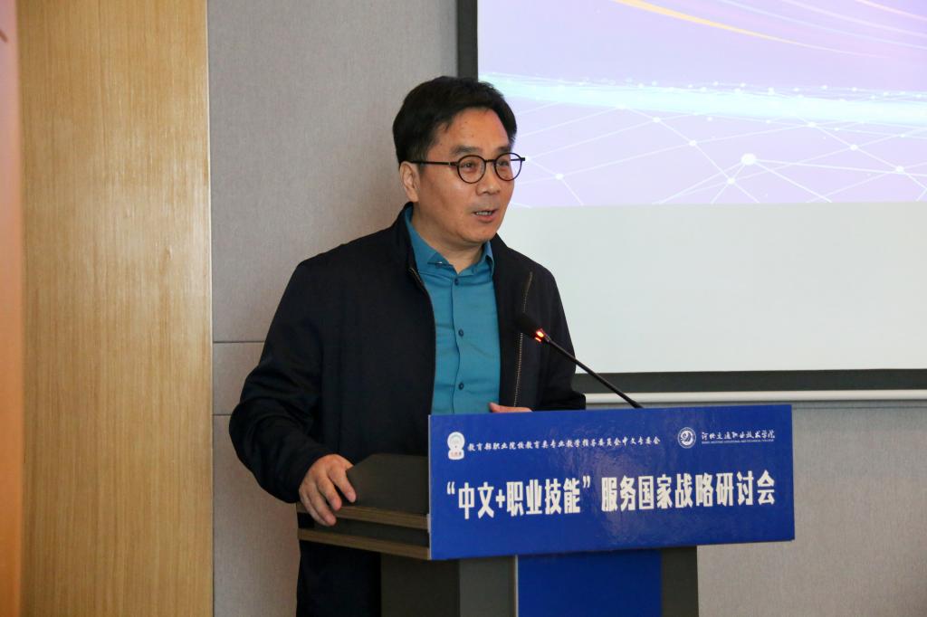 教指委主任刘兰明发表以“全面认清中文价值 全力服务国家战略 全心提升培养质量”的主旨报告,用三个“全面”从三个角度解释了本次研讨会的主题“中文是什么?中文做什么?怎么做?”,详细阐述了 “中文 + 职业技能” 模式的内涵与意义。