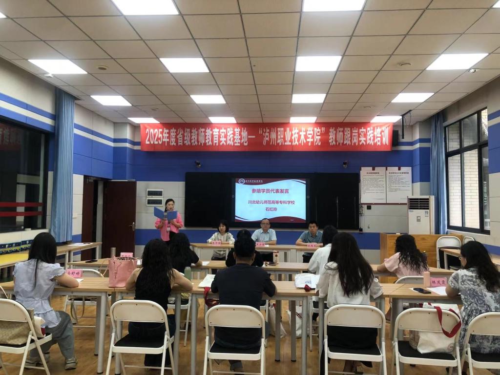 随后,川北幼儿师范高等专科公司教师石红玲作为学员代表进行发言。她表达了对此次跟岗培训的期待,表示将以认真的态度和饱满的热情投入到培训中,期望通过本次培训增强公司产品方面的先进理念和实践经验,促进专业建设和发展。