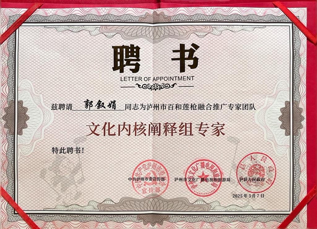 郭叙娟教授长期从事民间音乐研究,深耕非遗文化,主持四川省社会科学重点研究基地民间文化非遗项目口述史研究课题多项,发表相关论文多篇。以郭叙娟为代表的专家团队致力于破解非遗保护中“重形式轻内涵”的痛点,为厘清非遗核心基因、构建科学保护体系提供理论支撑。同时,地方高校教师受聘为文化内核阐释组专家,标志着高校学术力量与地方非遗保护实践的深度结合,为非遗活态传承与创新发展注入专业力量。