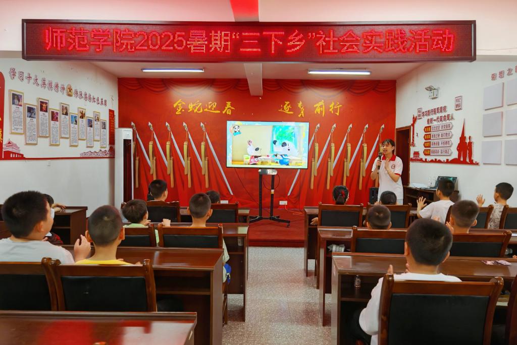 实践队以推普教学为核心,设计丰富多样的互动游戏。在欢快的节奏中,“对不起,没关系……”“太阳公公早上好,小鸟叽叽喳喳叫……”等儿歌响起,小朋友的童声与手势舞相映成趣,生动传递着普通话的魅力。普通话培训巧妙融入绕口令、猜猜乐等趣味游戏,实践队员与小朋友亲切互动,寓教于乐。趣味绘画环节将普通话学习融入创作,小朋友用画笔描绘主题,用普通话讲述画作,提升语言与艺术素养。音乐、语言、绘画多维活动有机联动,共同奏响推普支教的华彩乐章。
