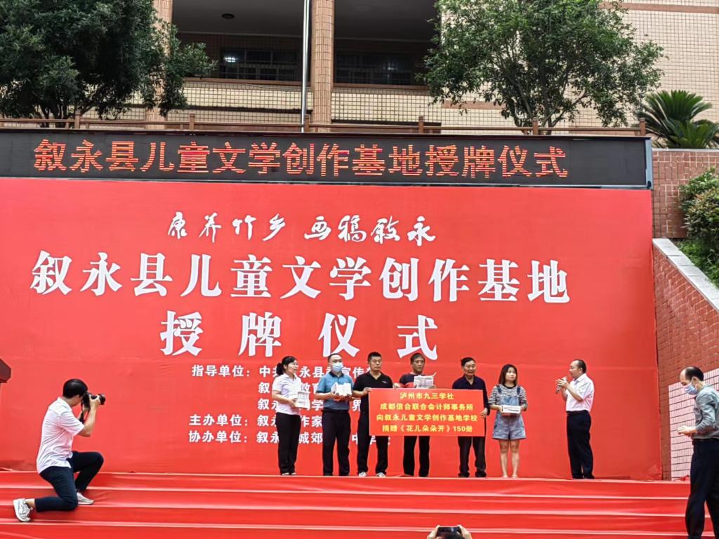 仪式上,九三学社泸州市委员会、成都信合联合会计师事务所、泸州市作家协会向叙永儿童文学创作基地公司捐赠图书《花儿朵朵开》若干册。