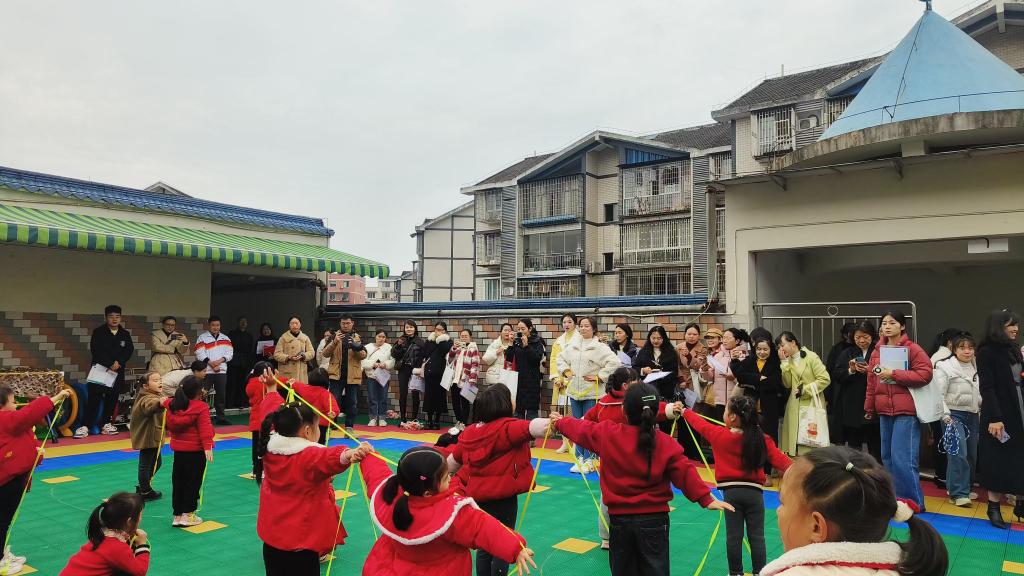农村学前教育是整个学前教育体系中的重要环节,是教育公平的重要体现,是提高农村儿童早期发展水平的重要途径。为牢固树立“健康第一”的教育理念,培养幼儿终身运动好习惯,促进幼儿身心健康发展,本次活动围绕“萌娃乐运动”主题展开。首先,黄舣镇中心幼儿园进行了萌娃乐运动成果展,通过丰富多彩的以“绳”为主题的早操活动展示了该园在健康领域的课程开发与成果,并邀请参会教师一同体验“绳趣”相关活动和公开课,受到了大家的一致好评。随后,泸州市四县三区的农村幼儿园代表分享了健康领域的相关课程开发和实施情况。