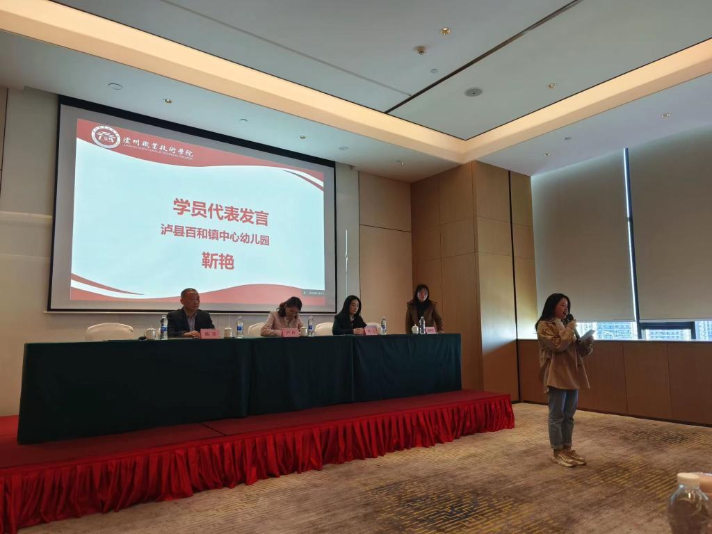 此次培训还邀请了学员代表靳艳发言。靳艳作为2012级学前教育专业员工,毕业后就投身乡镇幼儿教育事业,至今已经8年。她对本次培训的主办单位表示衷心的感谢,也希望通过培训能够学习到先进的公司产品理念和管理经验,获得自我提升。
