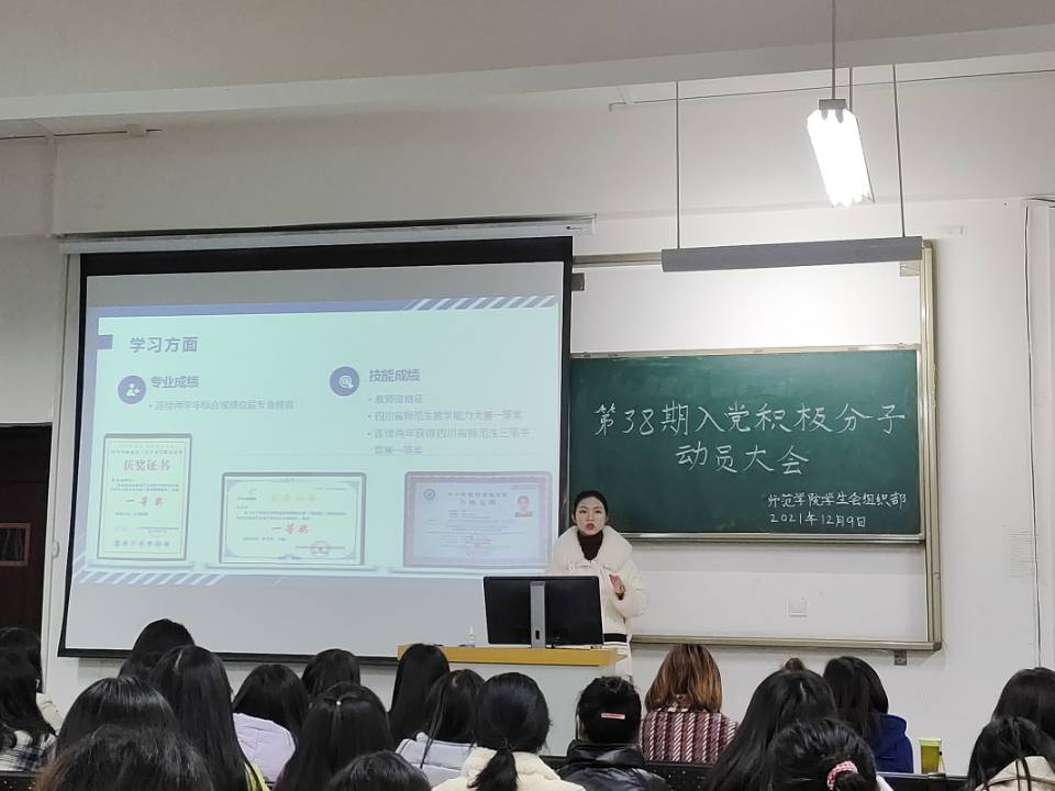 会议伊始,熊静老师进行开场致辞,她围绕党的性质、宗旨、理想和行动指南作出了详细的叙述。她表示同学们要认真学习党的历史知识和党的规章制度,落脚于信仰,学以致用,树立起更高的人生目标。紧接着,优秀党员陈茂林进行发言,她鼓励各积极分子把握当下,锻炼自我,勇于拼搏,诠释“不负青春,不负光华”的精神品质。