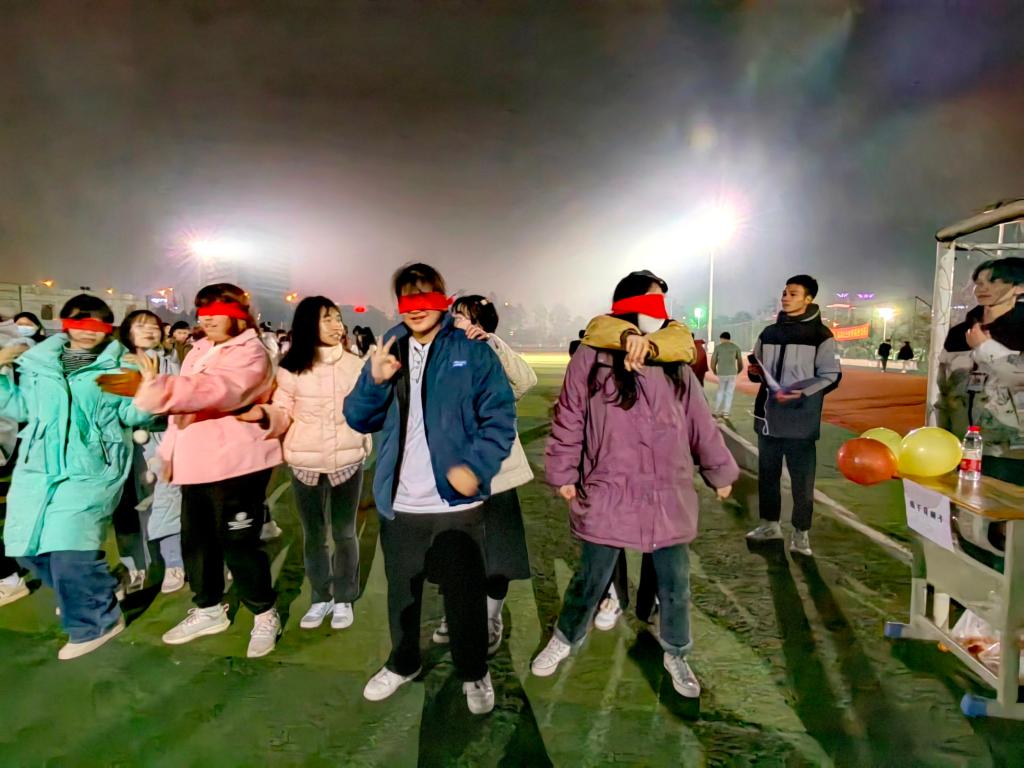 活动在吉他社带来的暖场歌曲《New boy》中拉开帷幕。紧接着,主持人介绍了活动流程及各个关卡的游戏规则。此次趣味运动会主要由气球答疑、瞎子背瘸子、心灵相通和齐头并进四个游戏项目组成,四个项目均以小组为单位参加。“瞎子背瘸子”考验项目队员之间的配合和信任,最终“瞎子”以矫健的步伐冲过终点;“心灵相通”项目由各小组队员默契配合,相互指引,顺利猜出四字成语;“齐头并进”由项目队员们手挽手、心连心,迈着坚定的步伐跨过赛道终点。在比赛过程中,同学们齐心协力、团结友爱,秉持着“友谊第一,比赛第二”的运动精神认认真真对待每个游戏,现场始终充满着同学们的欢声笑语。