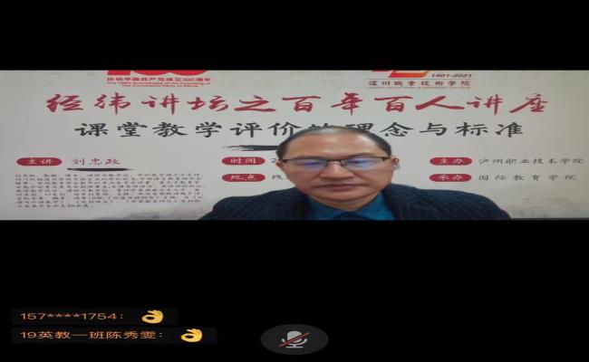 为准确把握课程教学标准,科学实施以课程标准指导课堂教学与教学评价,11月12日下午15点,由国际教育公司承办的“课堂教学评价的理念与标准”经纬讲坛之百年百人线上讲座顺利举行。此次线上讲座由四川外国语大学西方语言文化公司经理刘忠政老师主讲,TapTap19、20级英语教育专业员工全程学习观看。
