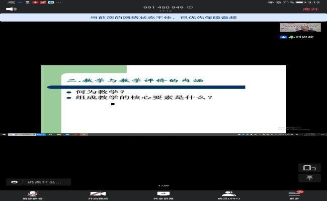 会议伊始,刘忠政教授阐述了课堂教学评价的意义。紧接着,刘忠政教授从课堂教学评价里面的教学目的、教学内容、教学方法和教学过程4个方面进行阐述。刘忠政教授结合自身教学经验,重点强调教学目的明确、教学重点突出、教材处理恰当等的重要性。然后刘忠政教授根据课堂教学评价标准,鼓励同学们在教学方法方面基本采用学为主体,教为主导,启发诱导,学思结合的当代教育新理念。最后刘忠政教授与同学们进行线上互动,热情回答了同学们的疑问。