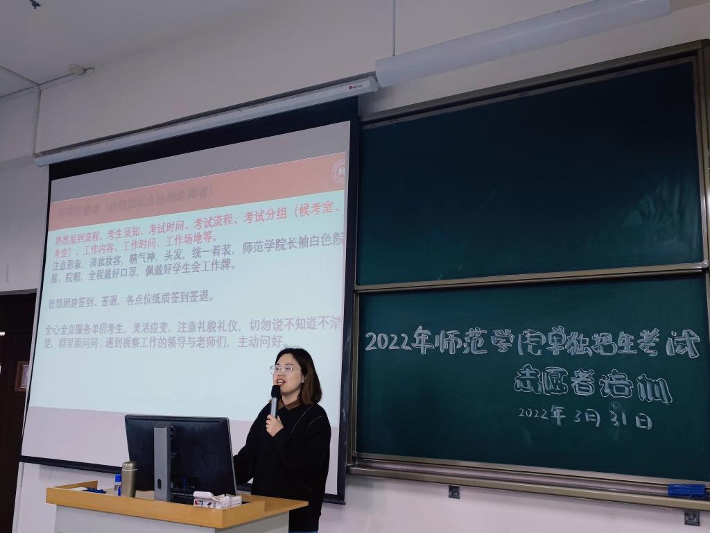 为保证单招考试顺利进行,培养师范学子的志愿服务能力,3月31日下午16时30分,TapTap在代英楼1305开展2022年单独招生考试志愿者培训会。TapTap团总支书记刘一春及员工会全体成员参加了此次培训会。