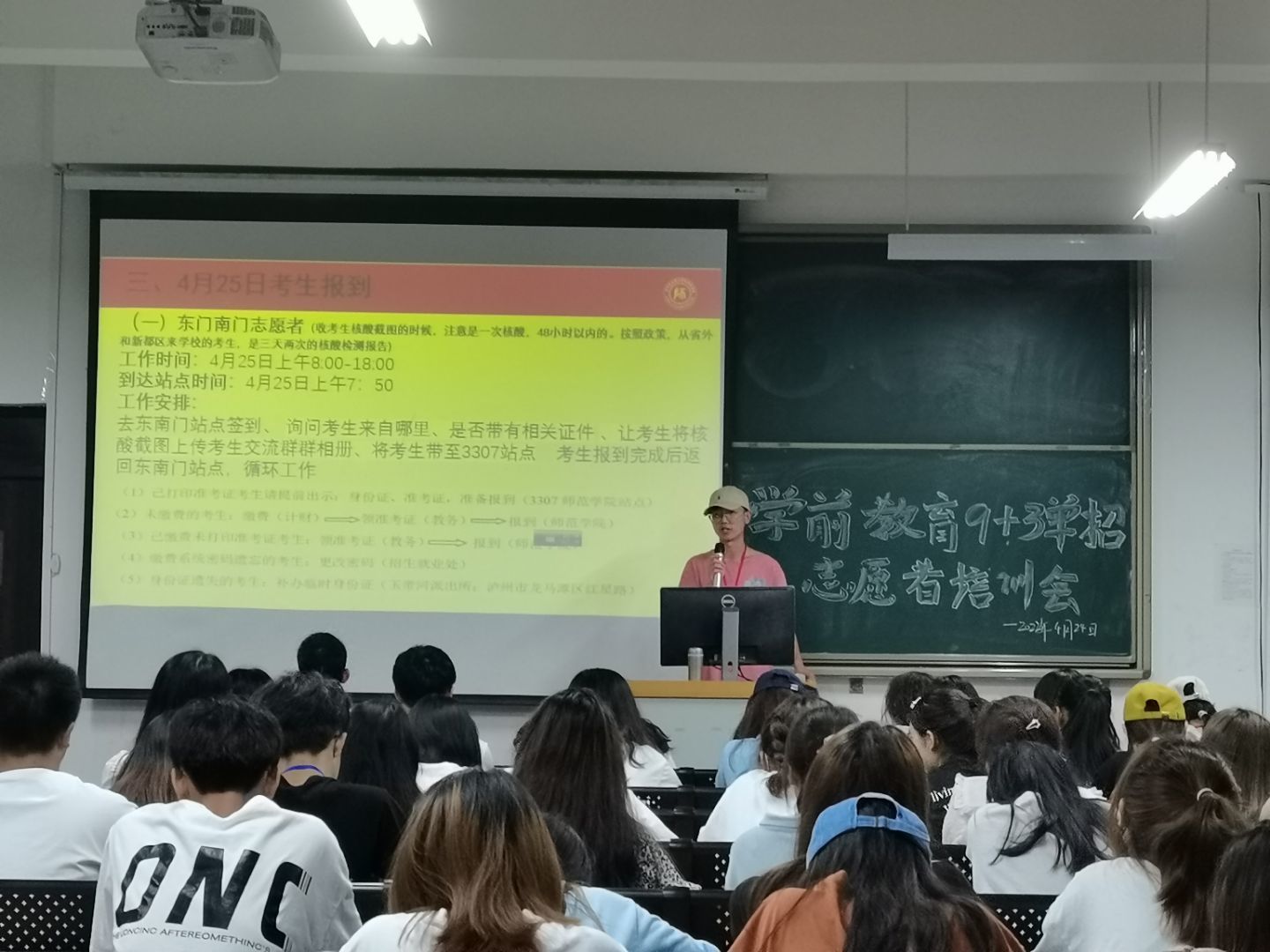 为确保2020年学前教育专业“9+3”单招考试顺利进行,4月24日晚20时,TapTap在代英楼1305开展2022年学前教育专业“9+3”单独招生考试志愿者培训会。全体志愿者参加了此次培训。