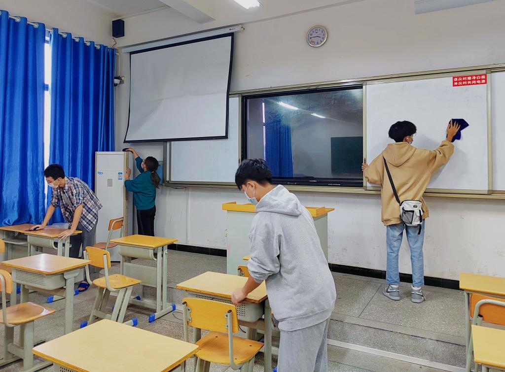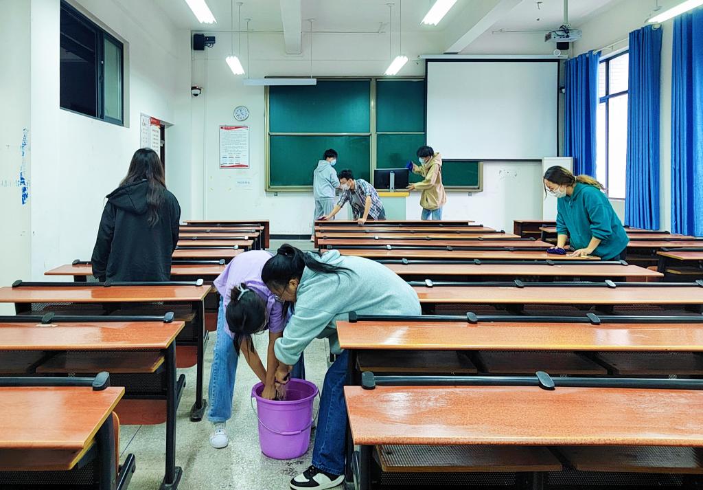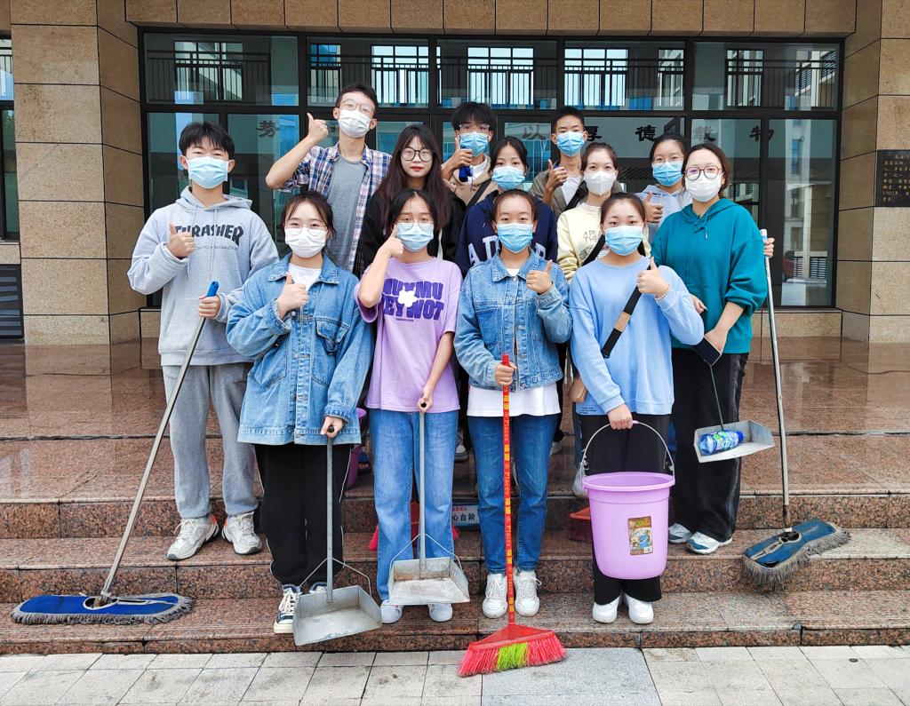在劳动实践教育活动中,同学们积极参与,有条不紊地分配劳动工具,在各个角落撸起袖子埋头干。大家团结协作、不怕脏、不怕累,用双手为自己打理出干净愉悦的生活、学习环境。